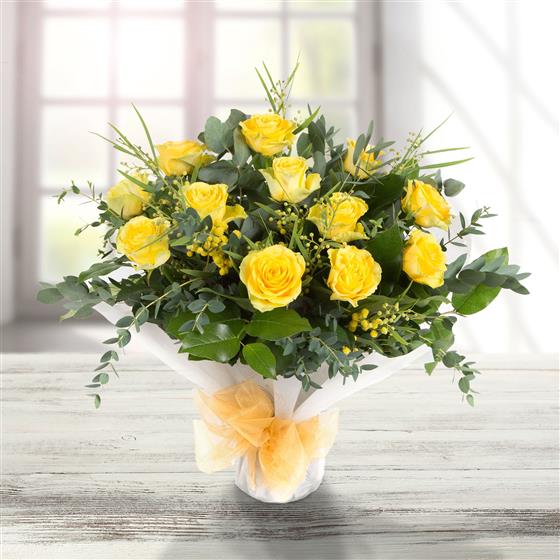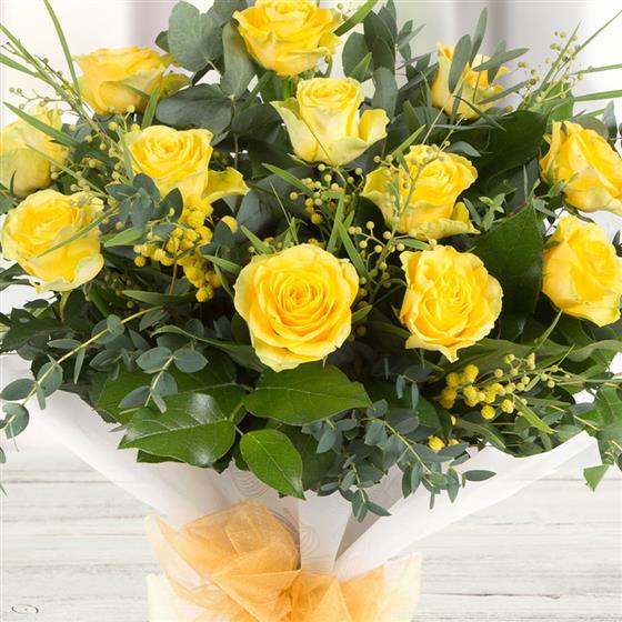 A dozen long stemmed golden yellow roses complemented with varigated foliage presented in water.