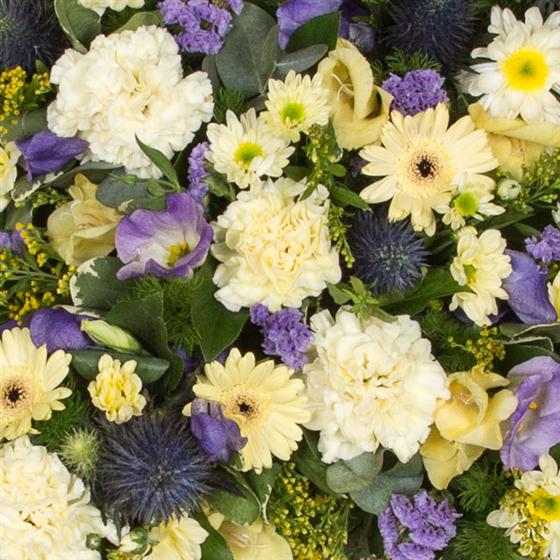 A loose cross of mixed flowers and foliage available as pictured or in a range of colours.