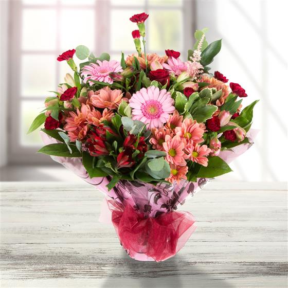 A hand-tied bouquet in a variety of deep red and pink shades encasing a single, long stemmed red rose.
