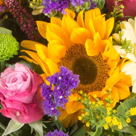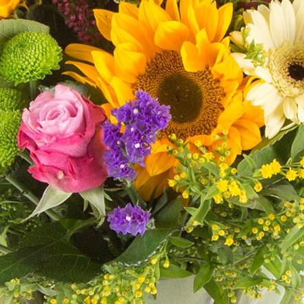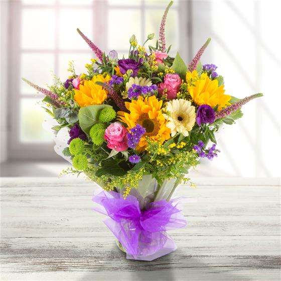 Send rays of sunshine with this colourful selection of golds, purples and bright pinks. To avoid disappointment please contact us to check sunflower availability.